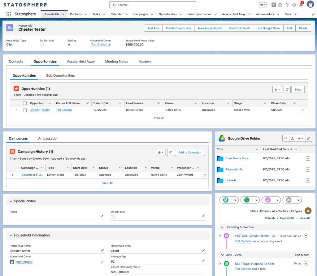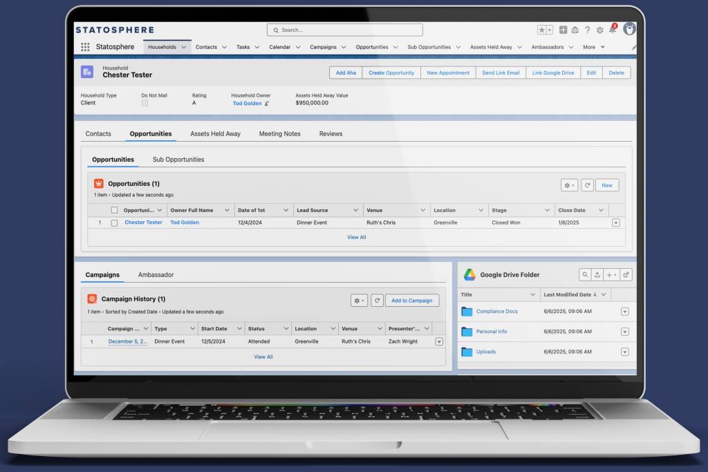 With Statosphere, you don’t just see a contact — you see the full picture. Instantly access notes, tasks, emails, call logs, meetings, opportunities, financial summaries, campaign history — and even the household’s dedicated Google Drive folder. Upload, download, and organize files directly within Salesforce without needing to open Google Drive.